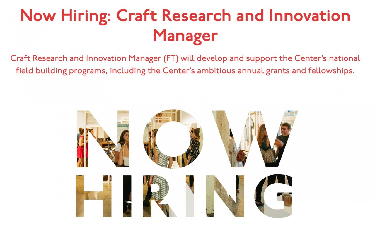 The Center for Craft is looking for a full-time Craft Research and Innovation Manager to develop and support the Center’s national field building programs, which seek to increase the value and relevance of craft to society through awarding grants and fellowships, convening thought leaders, documenting and disseminating research, and creating leadership initiatives in the field.