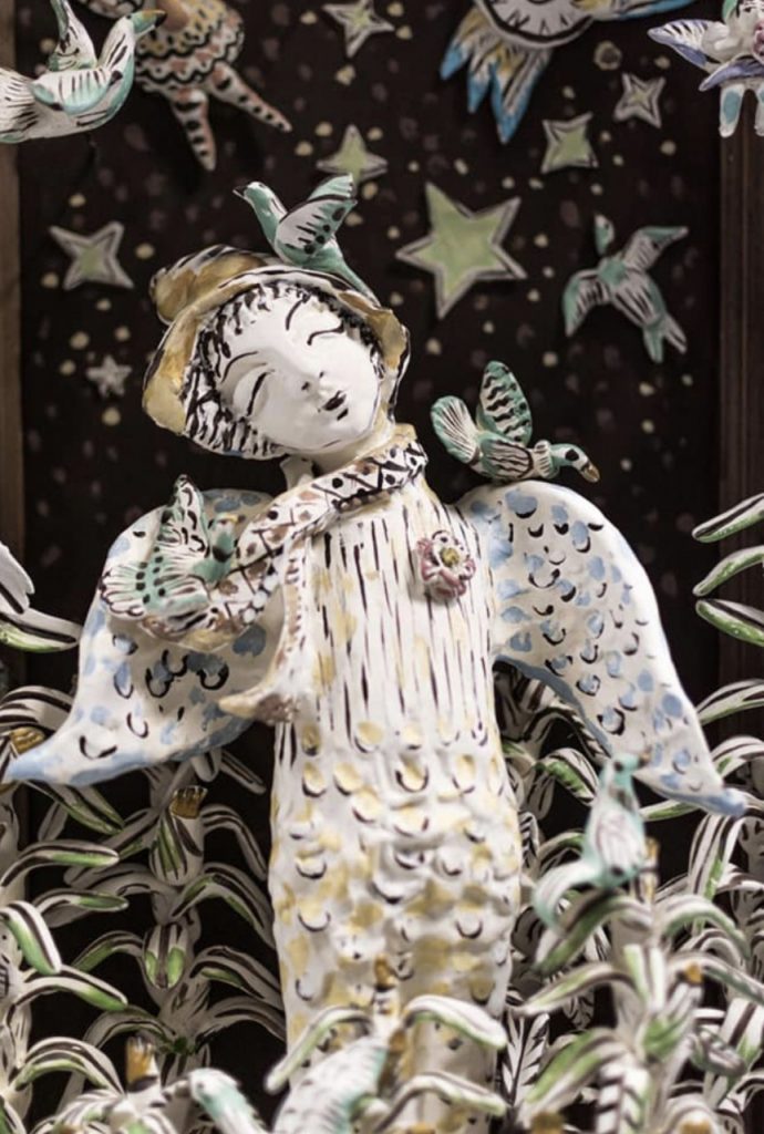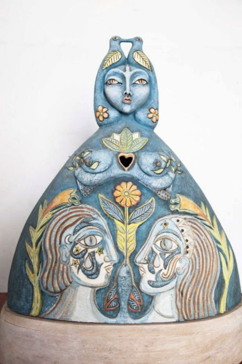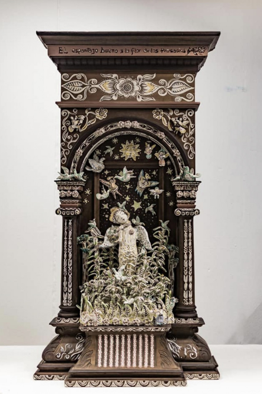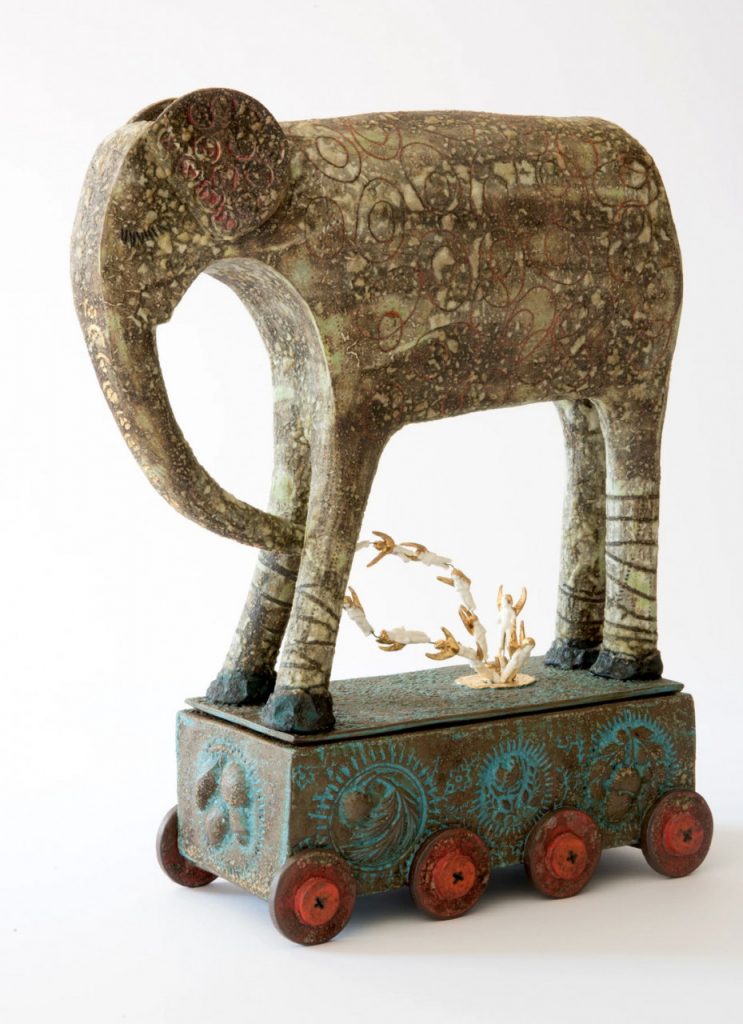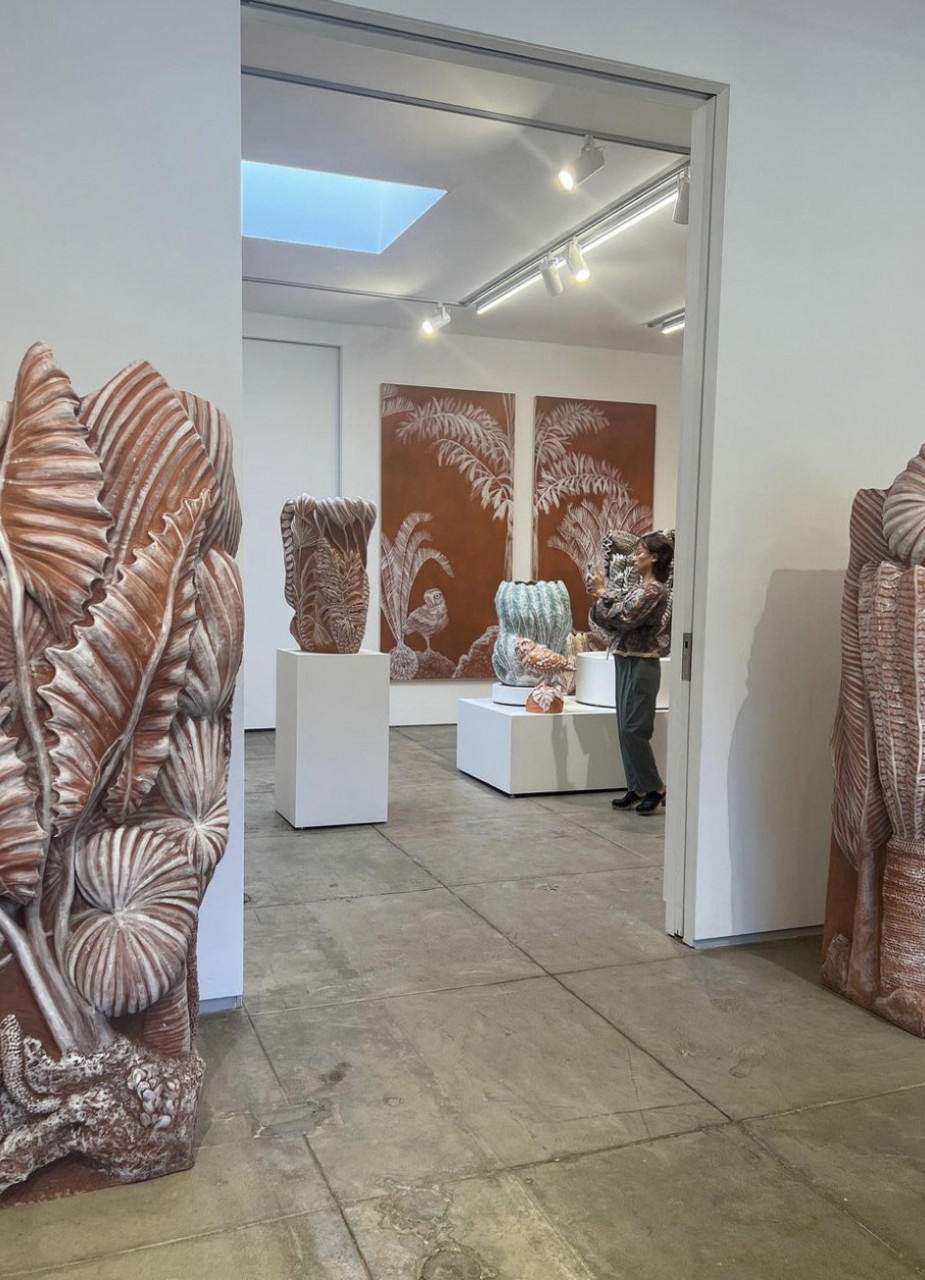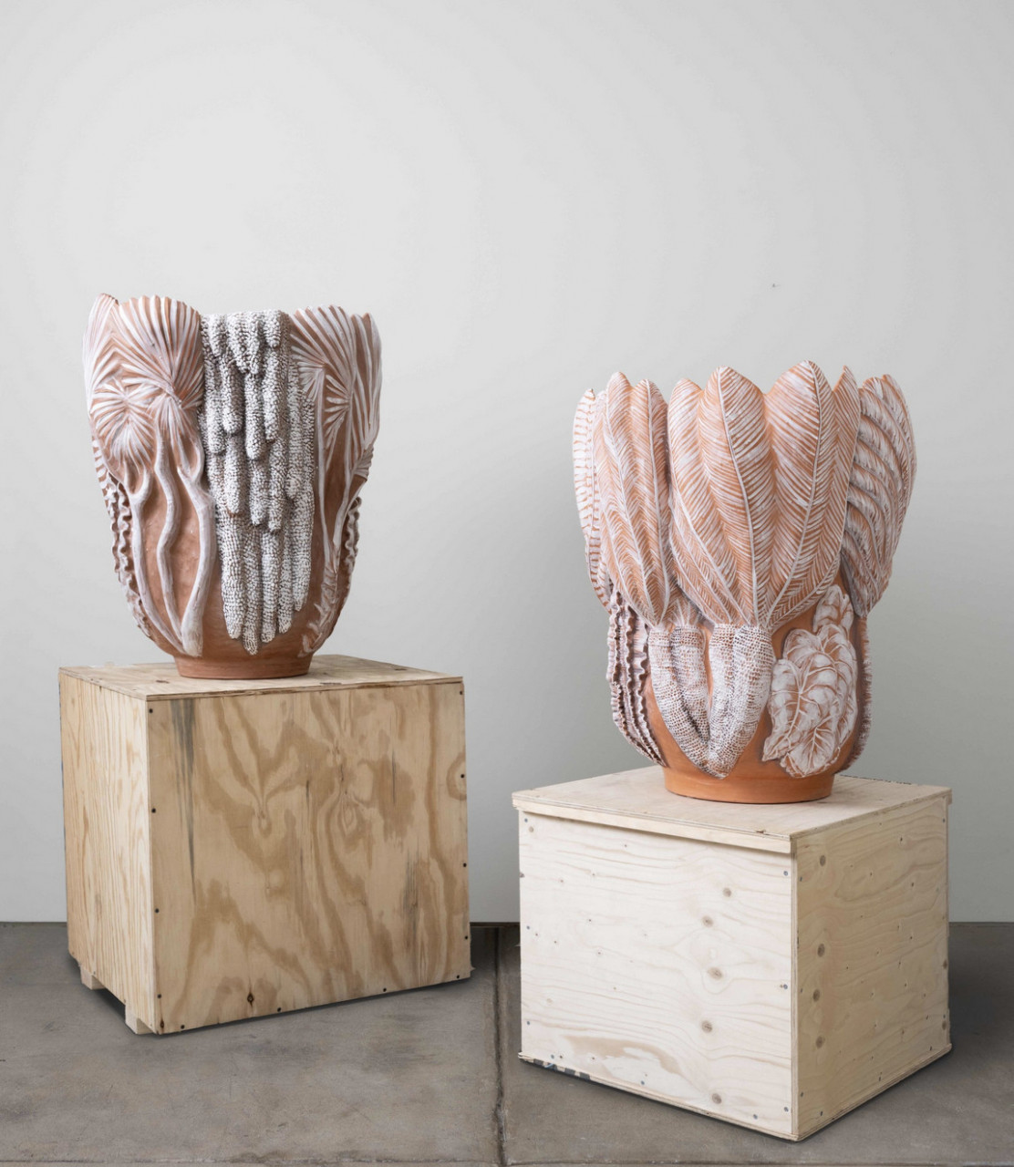 In this current body of work, Kim sculpts organically shaped bas-relief clay vessels in warm, earthy terracotta. While the themes in her work are archetypal, the artists filters and distills information from her immediate surroundings and cultural history as poignant subject matter in her art. Her narrative vessels depict a primal botanical landscape inspired by the Jurassic era vegetation in her garden and around Los Angeles. For the exhibition, she has created two of her most monumentally scaled works to date, each standing over six feet tall.