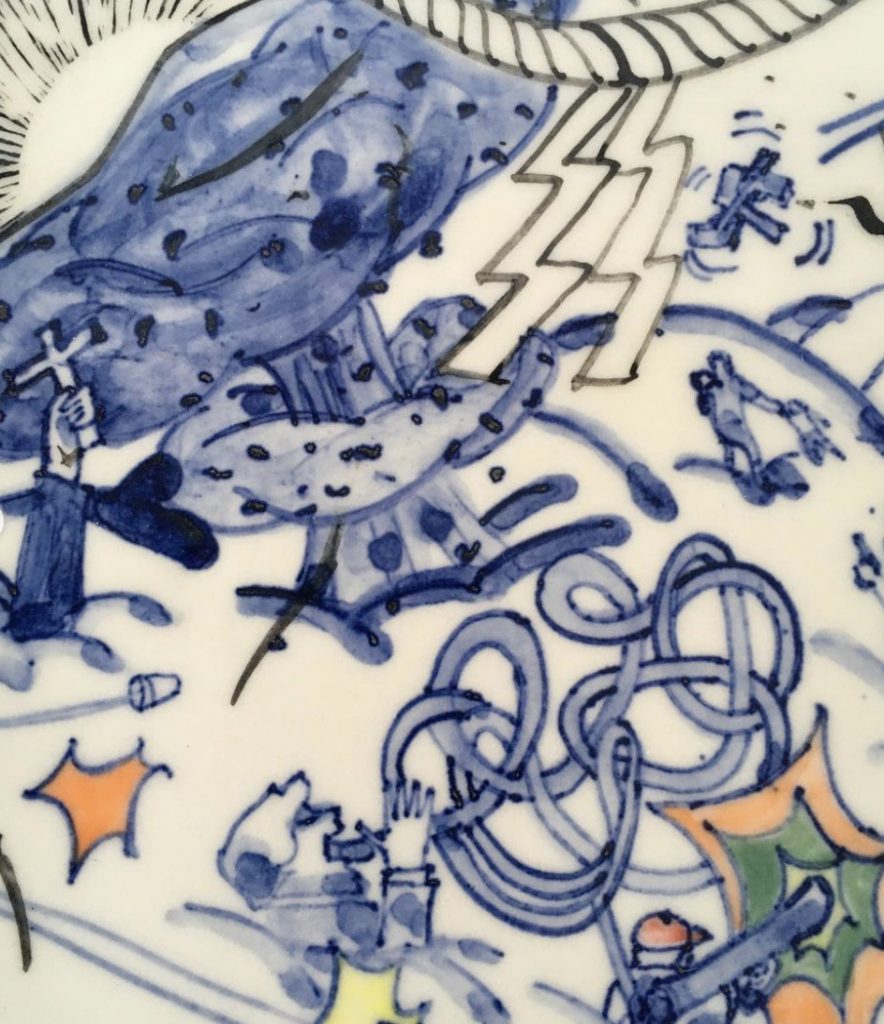 Deeply embedded in Korean culture is the shamanistic practice of strategically placing symbolically meaningful paintings, drawings and special objects in the home or temple as talisman for protection. The gallery installation engages this symbolic practice. Kim has covered the walls with paintings of ancient plants from her garden, enveloping her ceramic sculptures within the space. In using the same visual language as the vessels, Kim’s murals transform the architecture of the room, evoking the immersive environment of her own garden.