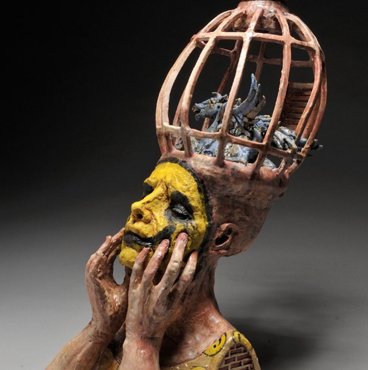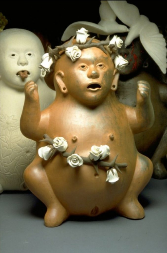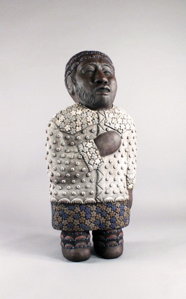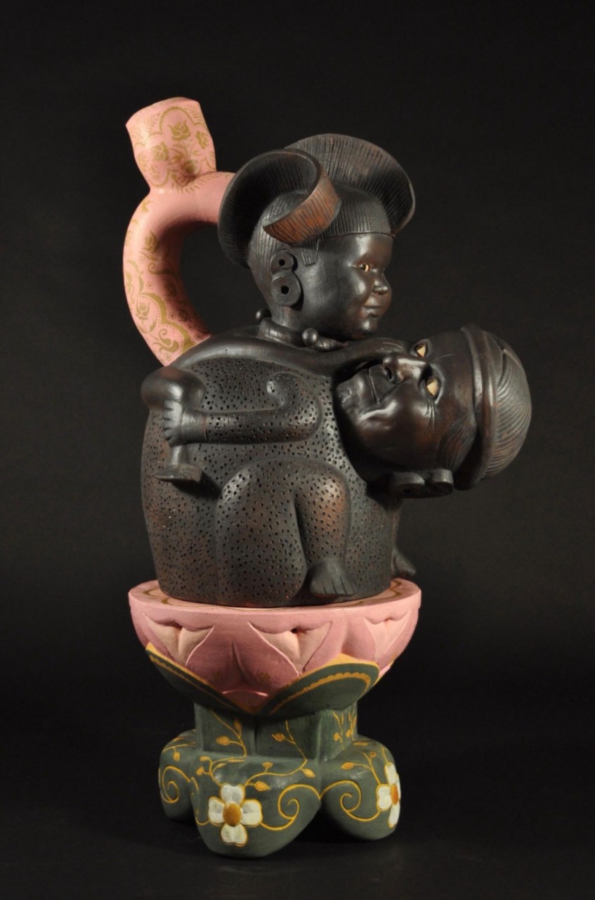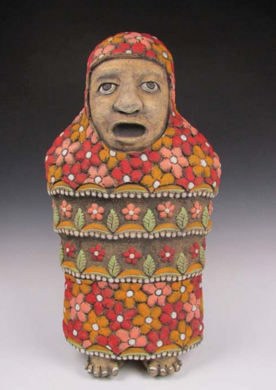 “Both artists focus on figurative elements; Wesley’s folk / naive-like people and dogs are sculptural with an edge to them (kind of awkward, a bit creepy and scary, but wonderfully created and memorable) while Ryan’s work is functional but decorated with fairly detailed and realistic surfaces (lifelike enough to straddle the line between functional and sculptural with a definite Latin American look to them).”
