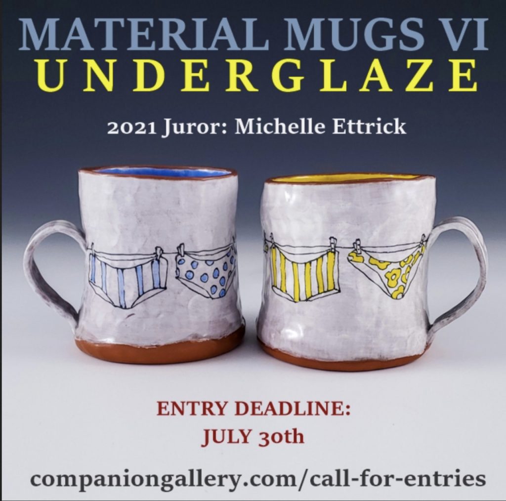 Material Mugs is our annual material based cups show and this year we will again be featuring underglazes! Our hope is to exhibit cups which express the full range of surface possibilities- underglazes that are trailed, painted, sprayed, transferred, washed, globbed on, inlayed etc.