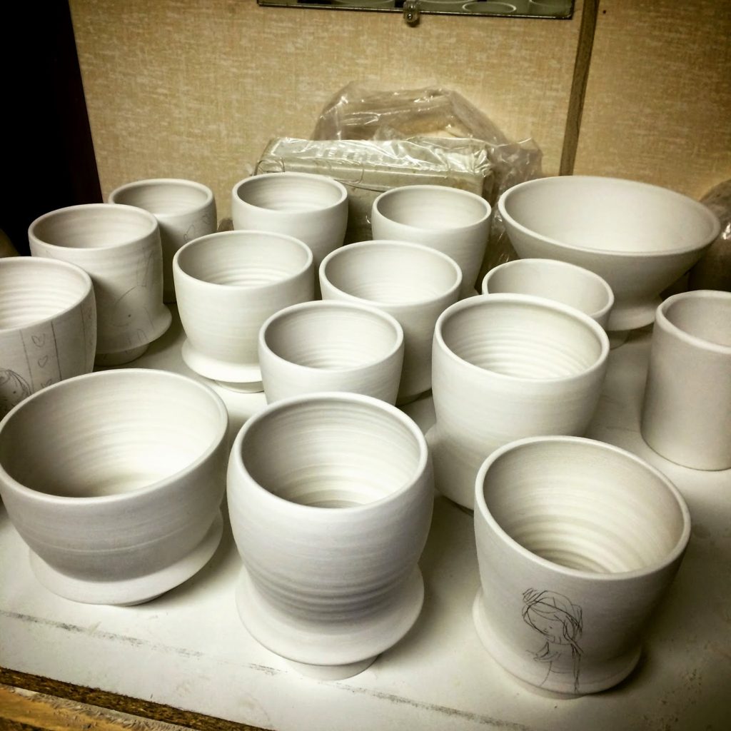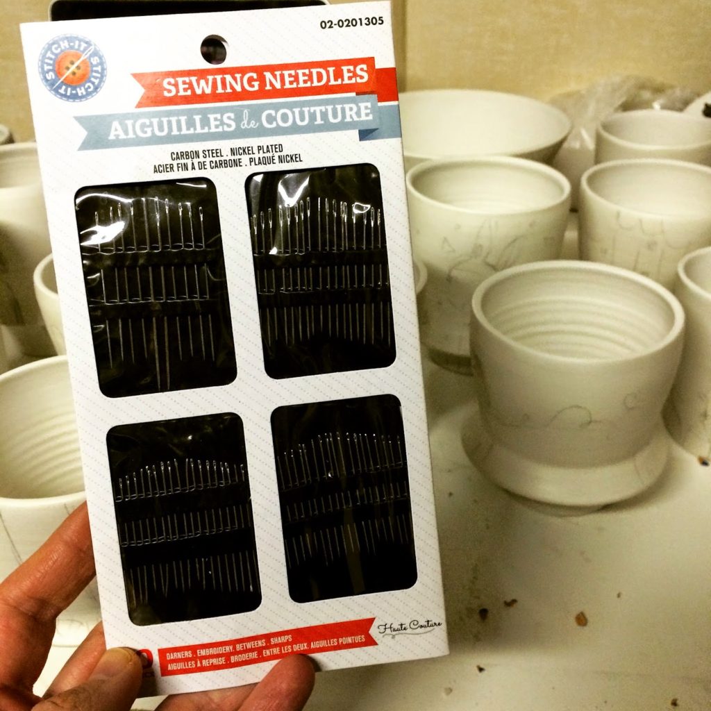 More and more frequently lately i’ve been getting emails and instagram messages asking about how I achieve the thin drawing lines on my functional dishes. Hopefully without risking any and all future workshop invites I’m going to share the secret today. I draw the images in pencil on bone dry clay, cover that in wax and then use cheap dollar store sewing needles to carve the drawing through the wax in into the clay surface. I then use a black underglaze to fill in the lines.